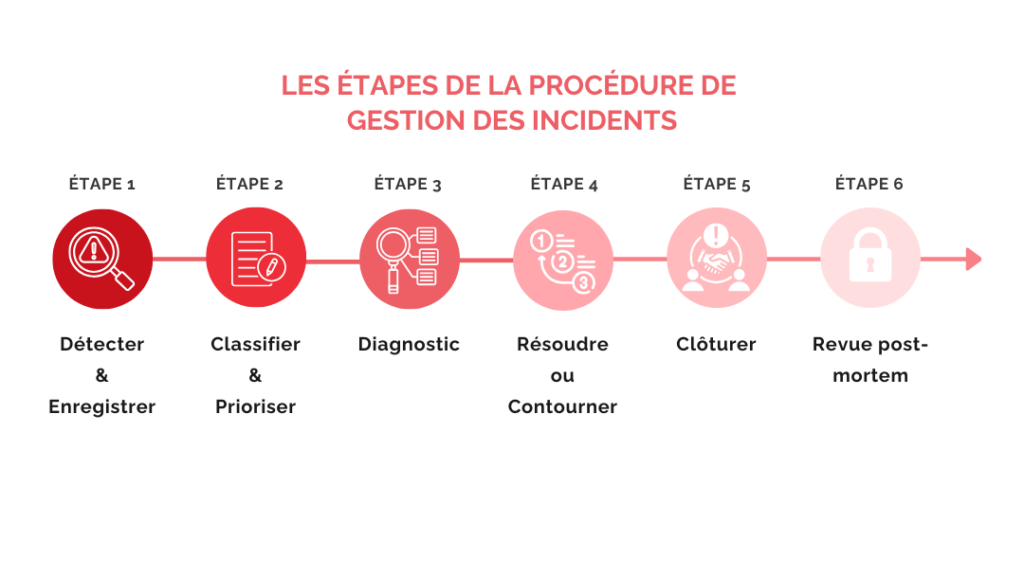 En suivant une procédure dans l’objectif de restaurer le service le plus vite possible, même avec une solution temporaire : u003cbru003e- Détecter et enregistrer l’incident dans l’outil ITSM.u003cbru003e- Classer et prioriser selon l’impact et l’urgence.u003cbru003e- Diagnostiquer rapidement.u003cbru003e- Résoudre ou mettre en place un contournement (workaround) afin de rétablir le service.u003cbru003e- Clôturer et informer les utilisateurs.